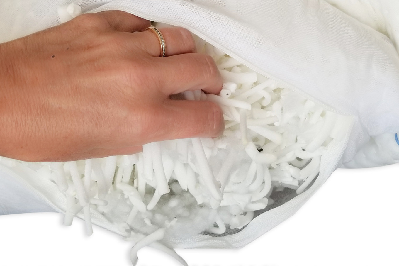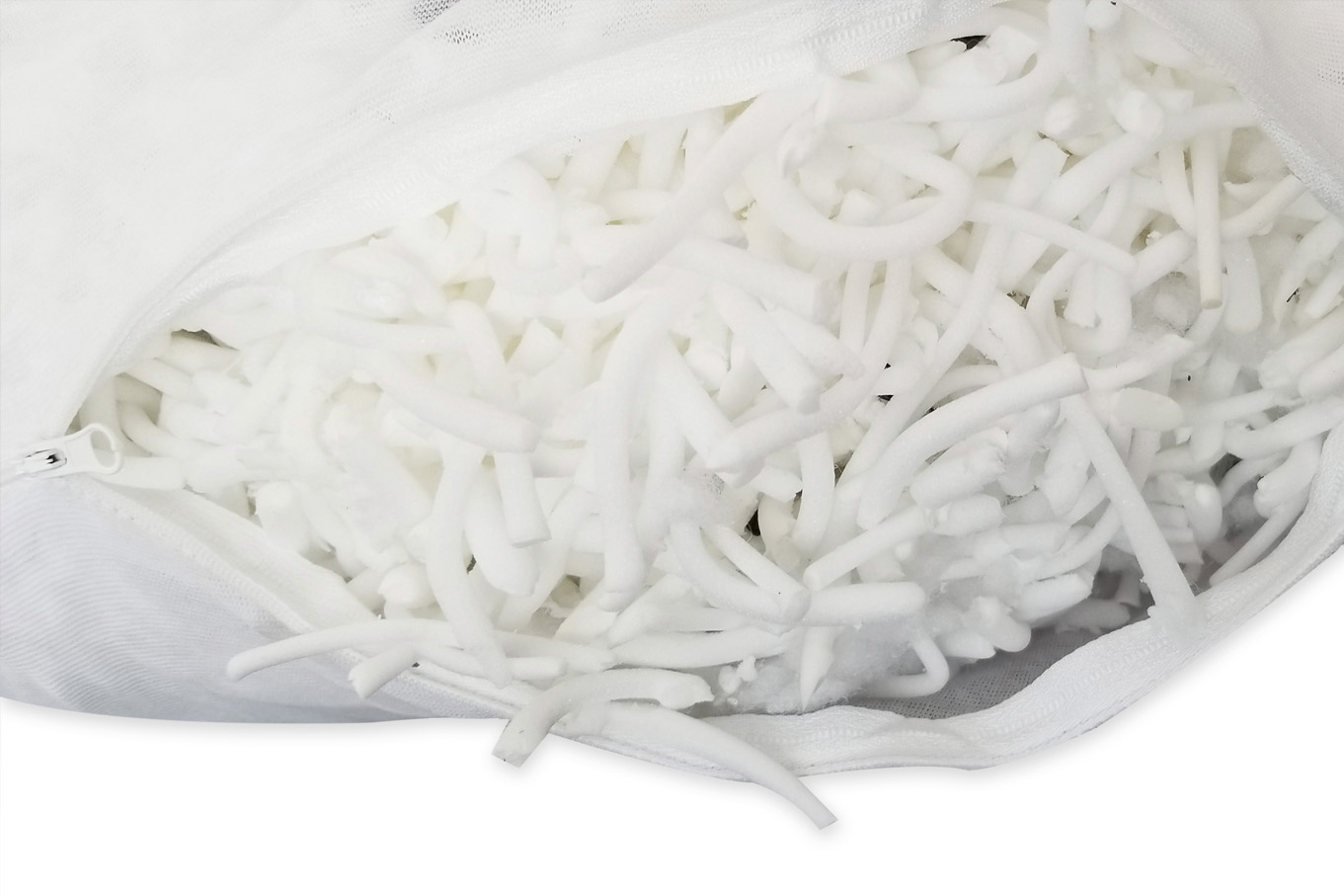 Het visco spaghetti is zeer veerkrachtig en zacht en hoogte van het kussen is verstelbaar door de hoeveelheid vulling in het kussen aan te passen.